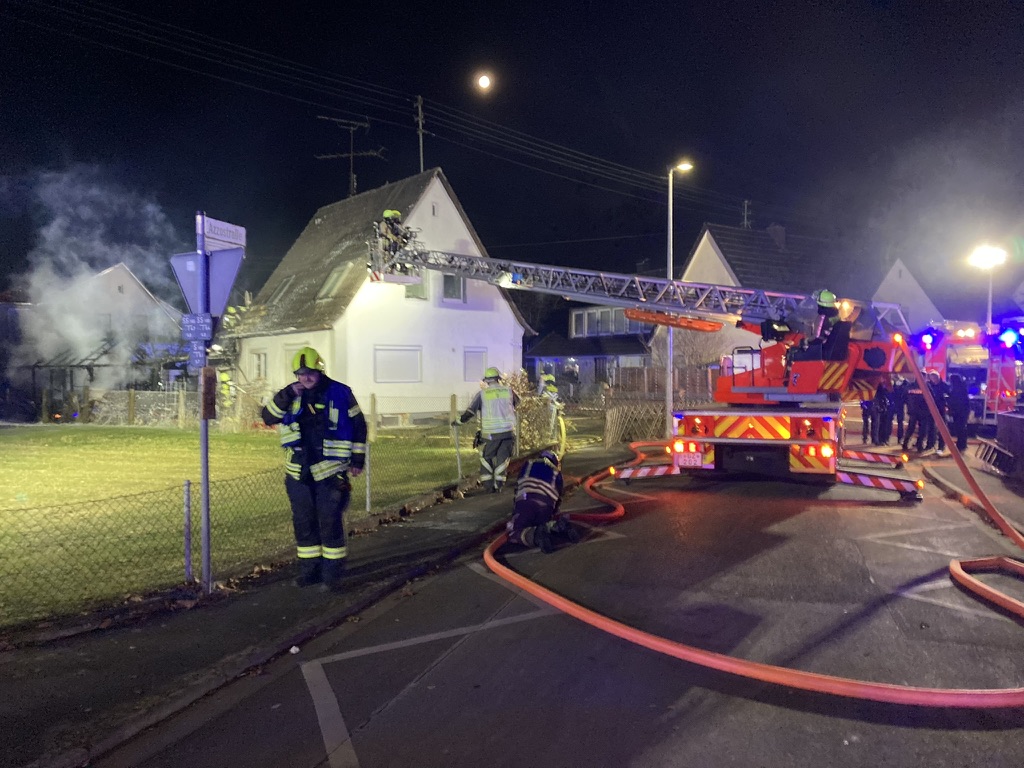 Beim Eintreffen der ersten Einsatzkräfte stand die Gartenhütte bereits in Vollbrand. Das Feuer hatte aufgrund der starken Wärmestrahlung bereits auf das angrenzende Wohnhaus übergegriffen. Zudem wurde ein benachbartes Mehrfamilienhaus in Mitleidenschaft gezogen.